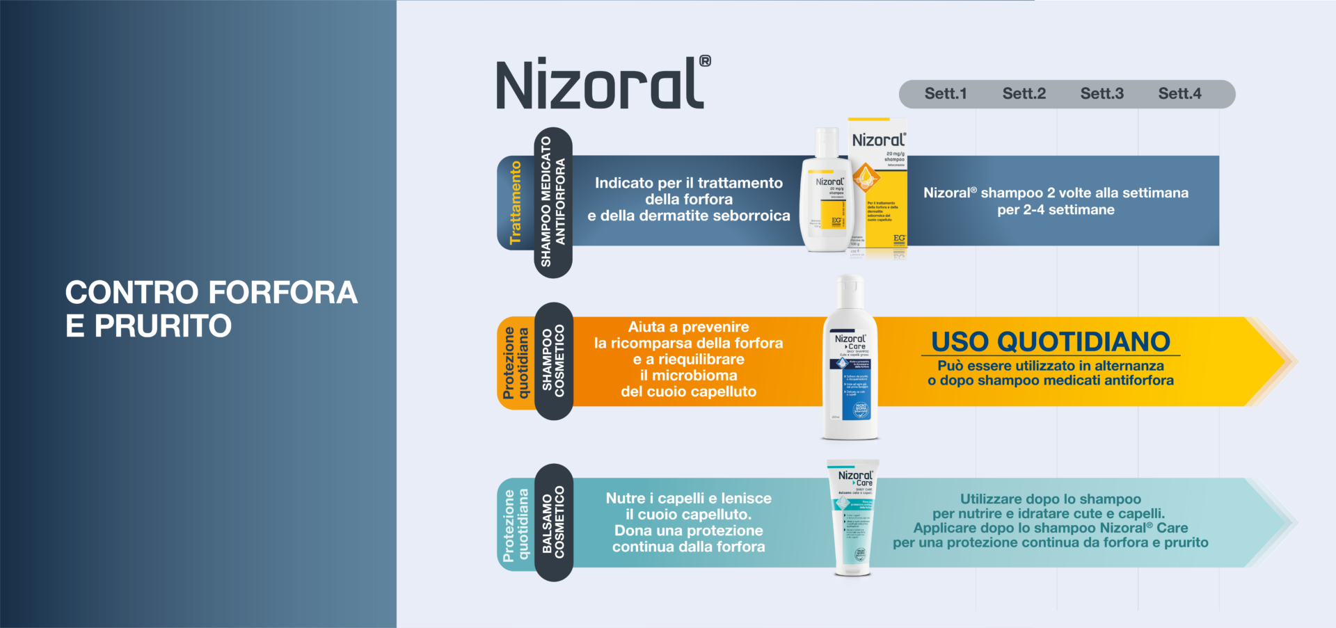 Nizoral® Care è uno shampoo quotidiano che aiuta a prevenire la ricomparsa della forfora e aiuta a riequilibrare il microbioma del cuoio capelluto. Può essere utilizzato in seguito ad un trattamento con uno shampoo medicato antiforfora per fornire una protezione continua da prurito e desquamazione.
